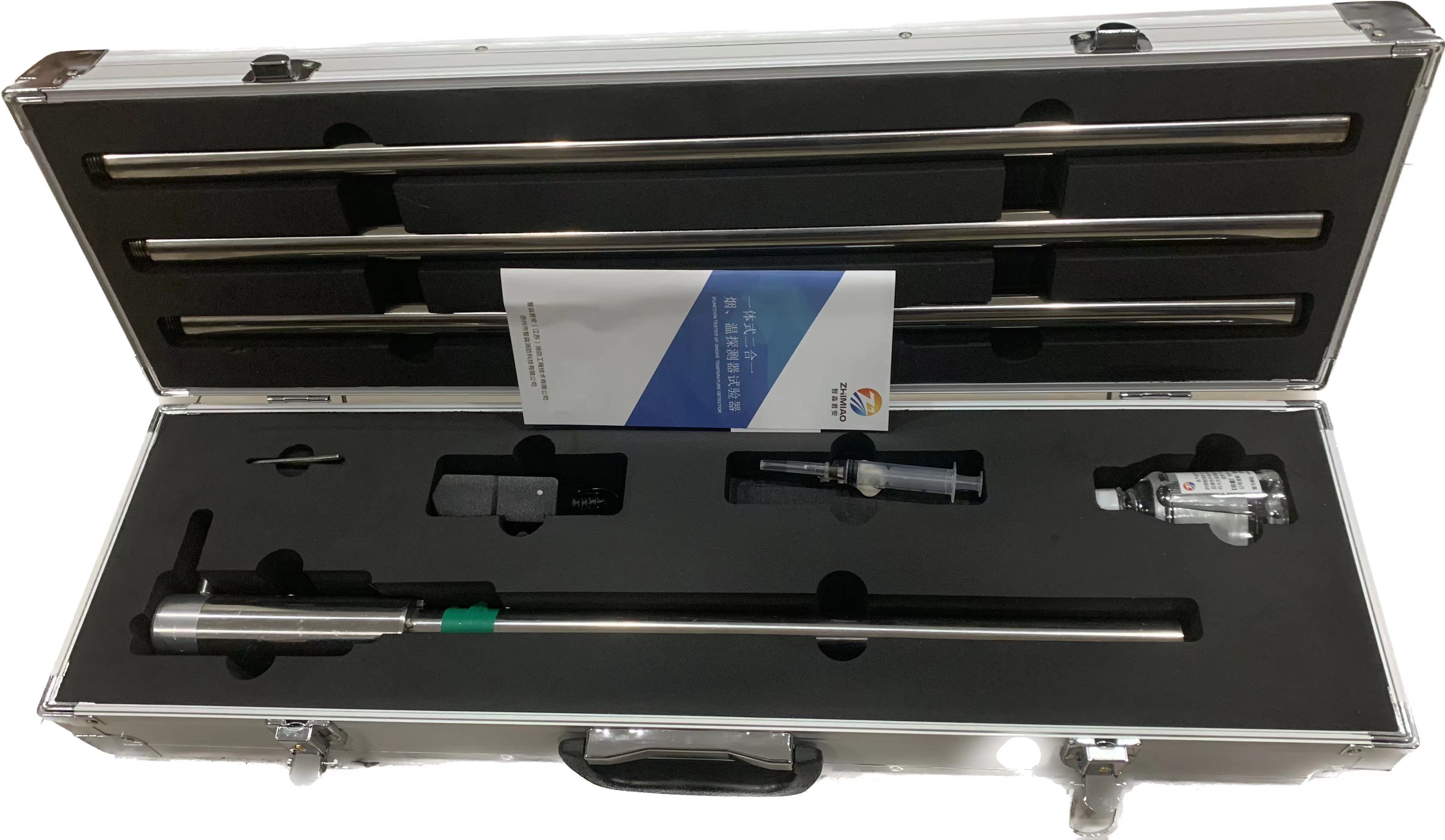 防爆型光電感應煙溫火災探測器試驗器機體、連接桿3根每個60cm、充電器、霧香液、注入器、六角扳手。